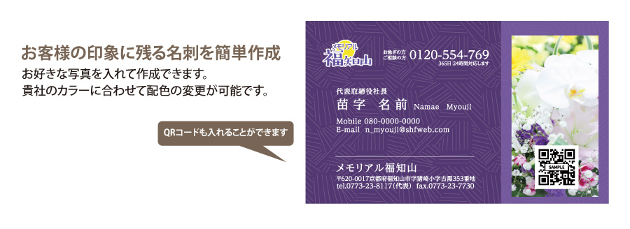 | 特長 | お好きな写真やQRコードを入れた名刺を作成できる、 4つの新デザインが登場! 貴社のカラーに合わせて配色の変更が可能です。 |
